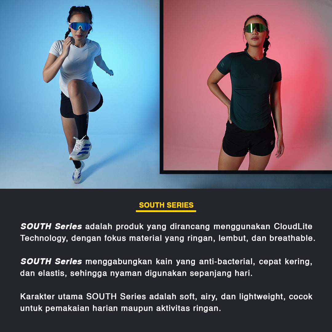 SOUTH Series adalah produk yang dirancang menggunakan CloudLite Technology, dengan fokus pada material yang ringan, lembut, dan breathable. SOUTH Series menggabungkan kain yang anti-bacterial, cepat kering, dan elastis, sehingga nyaman digunakan sepanjang hari. Karakter utama SOUTH Series adalah soft, airy, dan lightweight, cocok untuk pemakaian harian maupun aktivitas ringan.